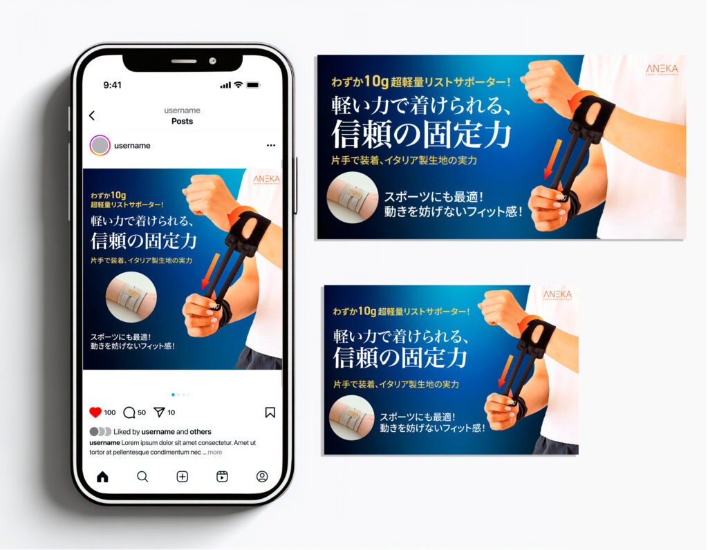 サポーターに矢印の装飾と”10g”数字を大きく見せて、ホールド感・軽量感を感じるデザインにしました。